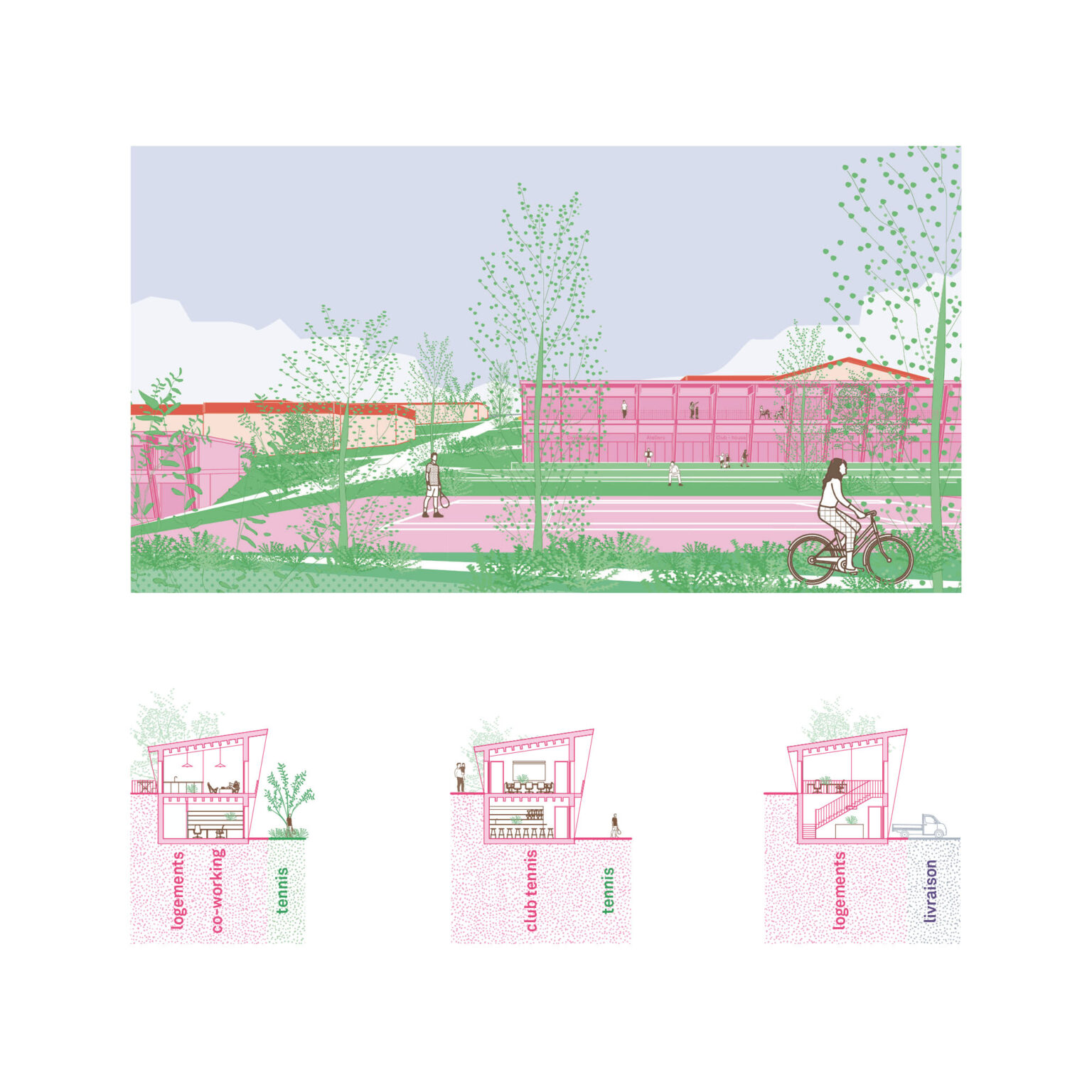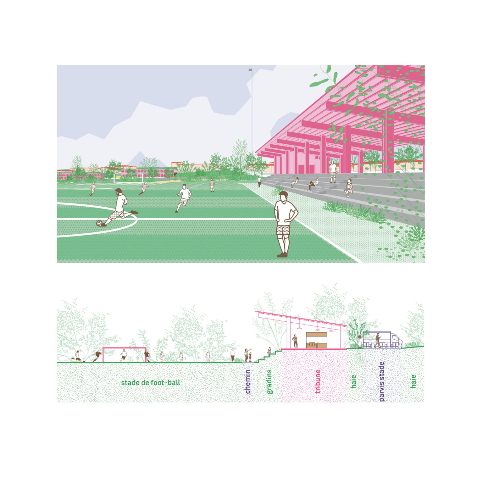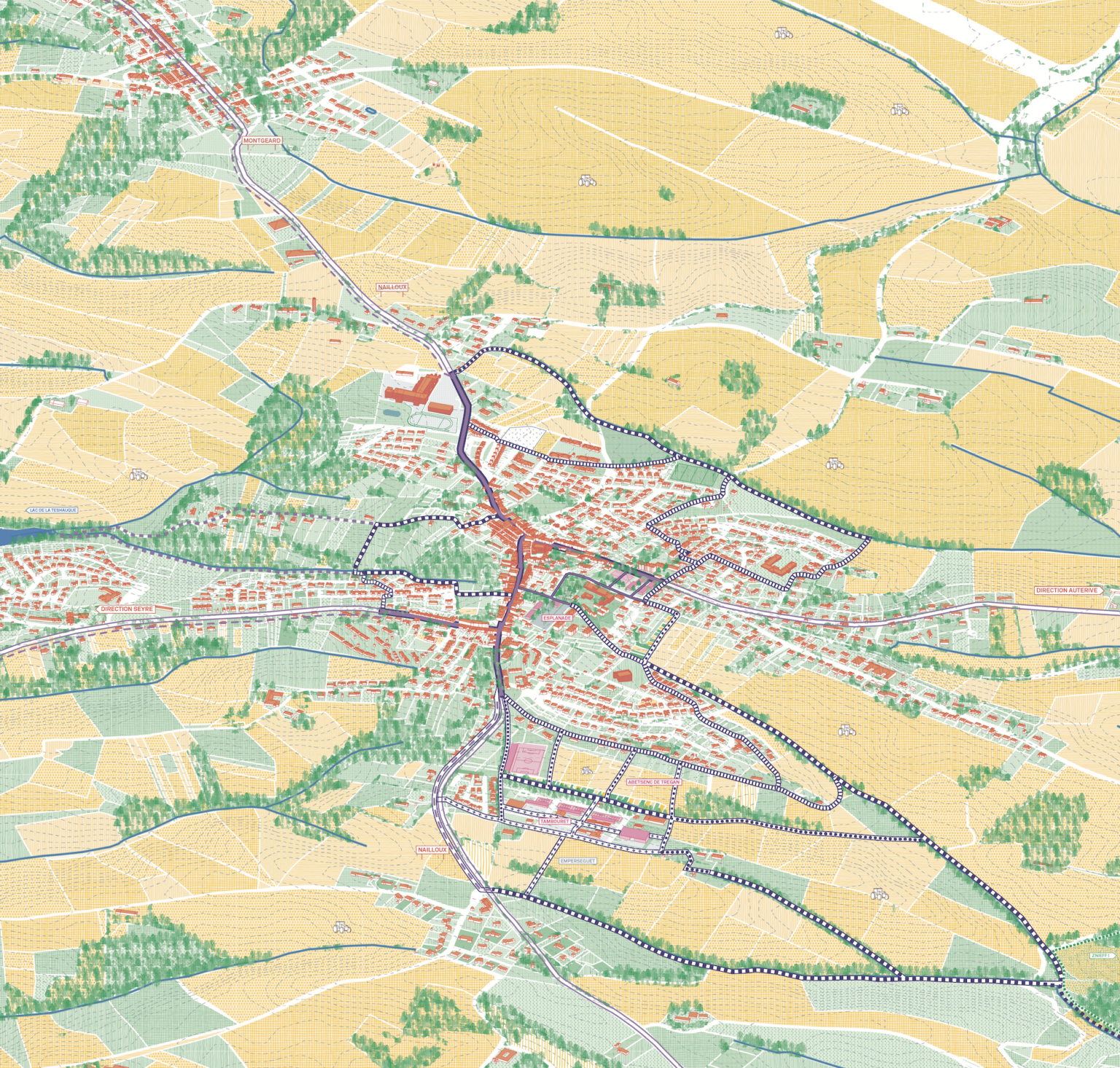 La proposition portée pour cette situation urbaine complexe repose sur un travail permettant de réparer et tisser des liens entre les différentes composantes de la commune. Il ne s’agit pas d’un grand geste urbain ou architectural mais de la mise en place de dispositifs permettant de cultiver des qualités de