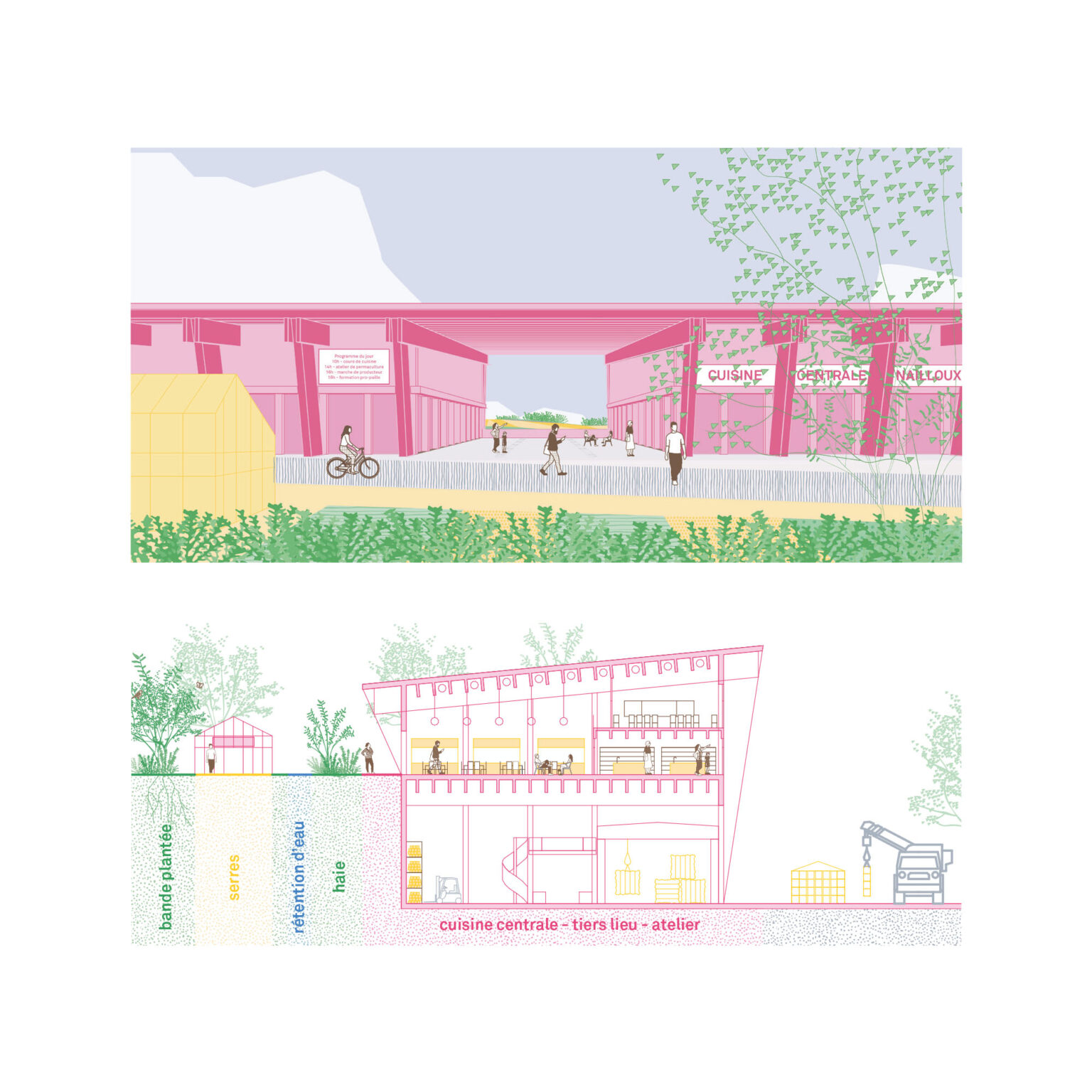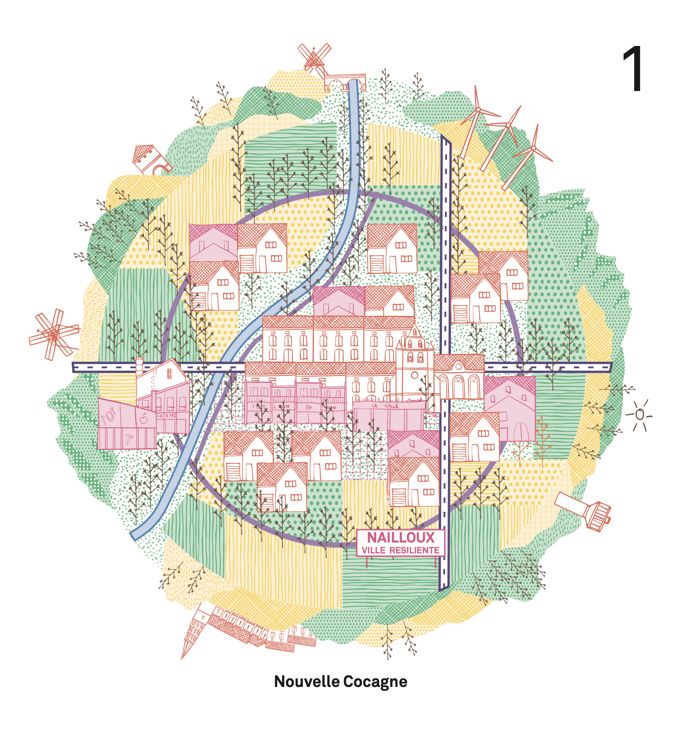 Un atlas précis des ressources est le point de départ pour projeter un rééquilibrage cohérent du maillage territorial Naillousain. Qu’elles soient humaines, architecturales, végétales, mobiles ou éphémères, le territoire est chargé de richesses qui ne demandent qu’à s’ordonner. Créer du lien, des échanges, des services rendus entre le vivant à toutes les échelles permet d’envisager une “perma-programmation” de la Nouvelle Cocagne sur la base de deux axes de réflexion :
