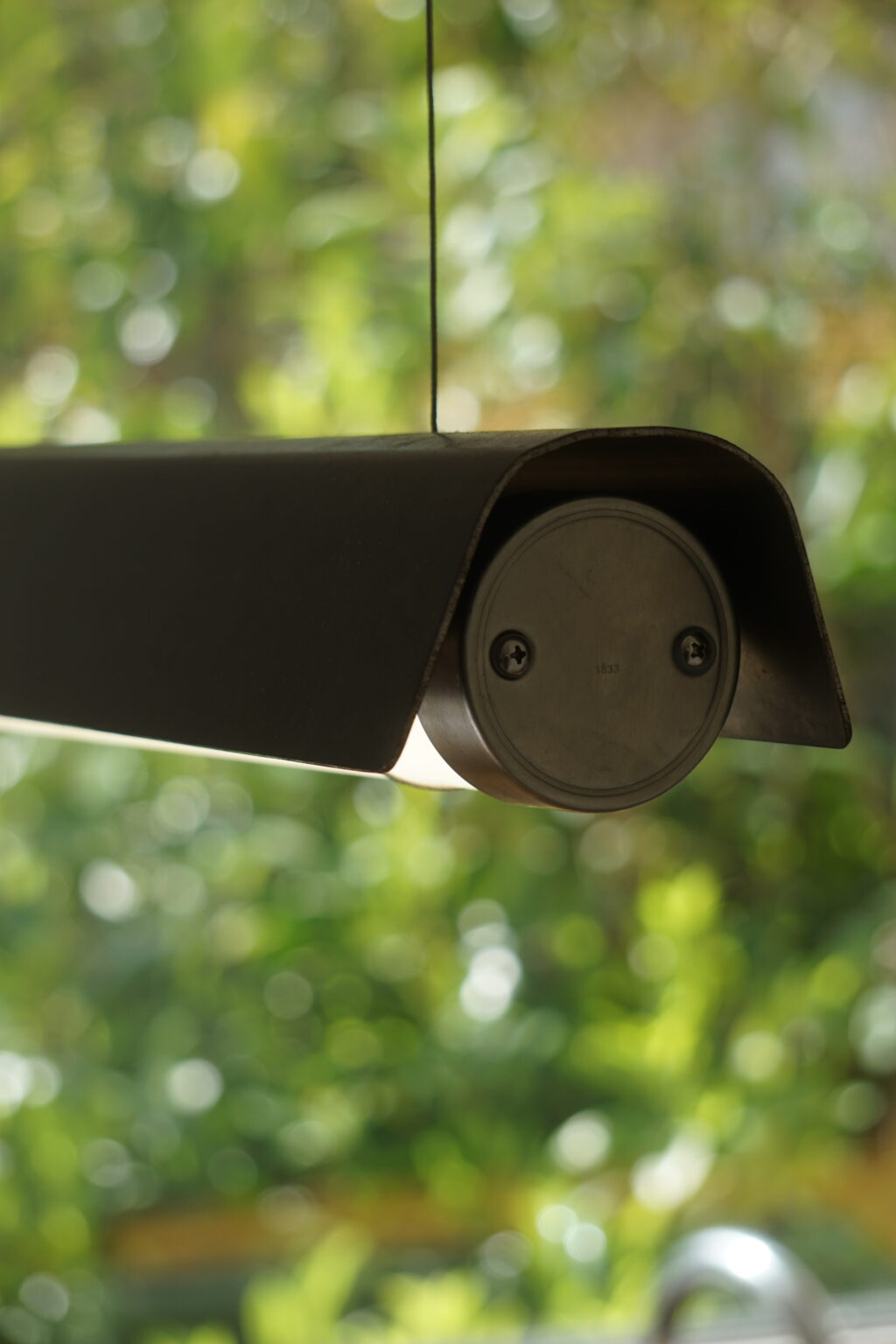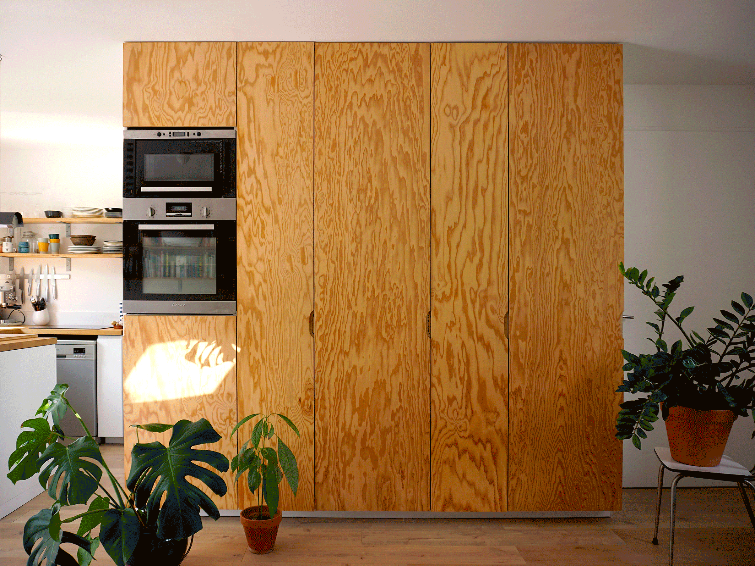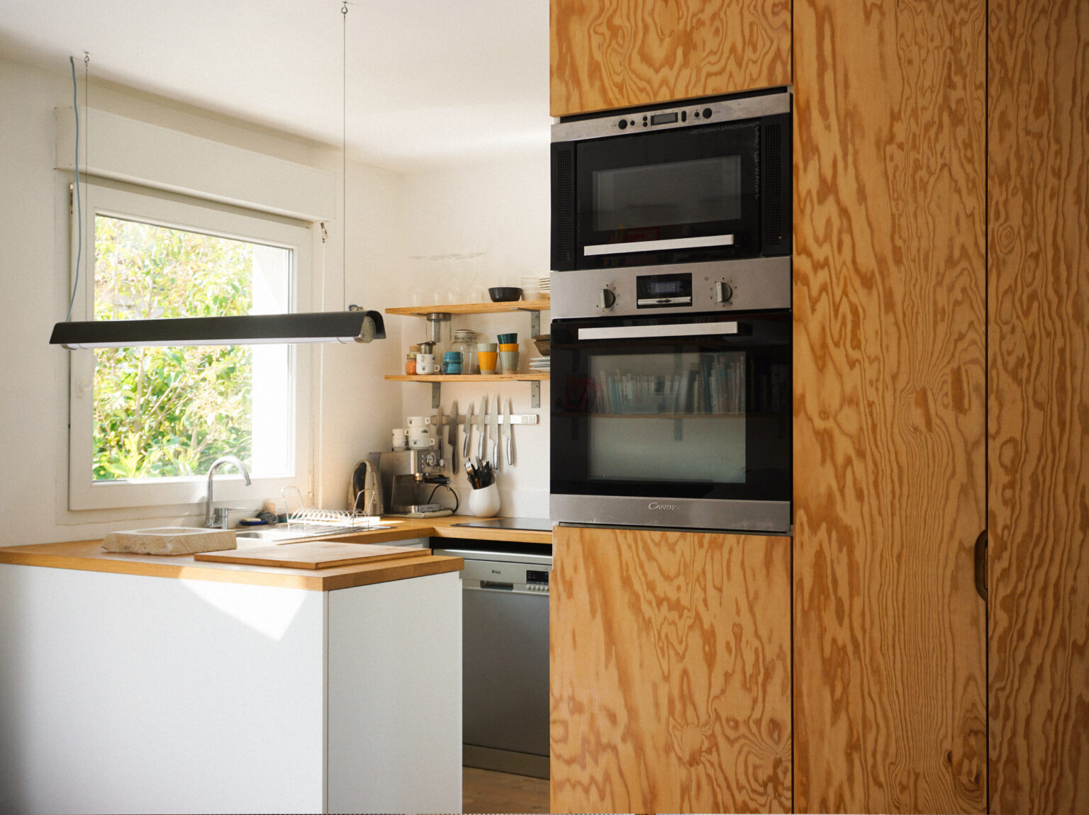 Un grand meuble central est conçu comme une interface entre les différents espaces. Il organise les circulations, structure les zones de travail et offre des capacités de rangement importantes, réduisant ainsi le besoin de cloisonnement. Le budget restreint a conduit à l’utilisation de placards standards, revalorisés par des interventions sur mesure : portes en pin maritime, poignées creusées dans le bois et portes à galandage spécialement intégrées au mobilier.