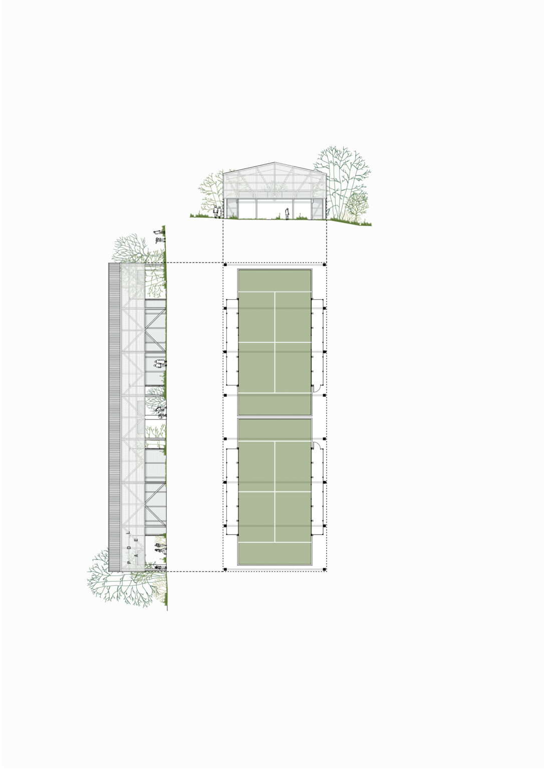 Bordé par une nationale très passante, favorable à la visibilité de l’équipement, le projet déploie les terrains le long de la route, créant une situation intermédiaire entre champs agricoles et urbanité. Le rez-de-chaussée, volontairement entièrement ouvert, permet d’assurer la ventilation naturelle de l’équipement tout en conservant des percées visuelles vers le paysage. L’équipement ne constitue plus une barrière mais un cadre ouvert sur le grand paysage.La partie haute est composée d’un bandeau de polycarbonate protégeant des intempéries tout en créant un effet de brise-soleil. La transparence de ce matériau génère des jeux de lumière : du dedans vers le dehors la nuit, du dehors vers le dedans le jour.