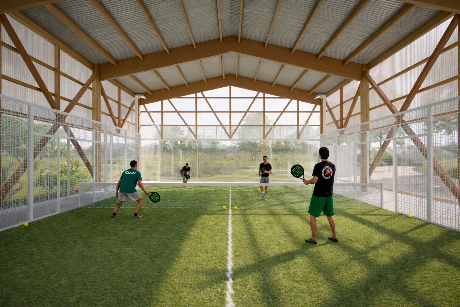 Situé dans la commune de Rieux-Volvestre, village du Papogay aux portes du Volvestre, le projet de halle sportive de padel prend place dans un environnement rural entre zone d’activité et champs agricoles. Ce sport de raquette bénéficie d’une visibilité croissante depuis plusieurs années et, à l’instar des complexes « five » des années 2000, engendre une prolifération de hangars métalliques peu coûteux, souvent opaques et toujours austères dans les paysages de nos villes et campagnes.