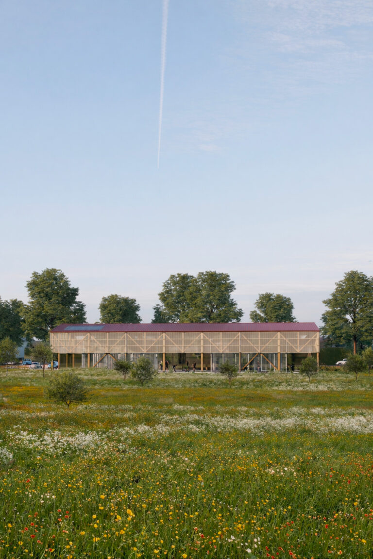 L’enjeu du projet réside précisément dans cette situation : réaliser, avec un coût maîtrisé, un équipement adapté et cohérent dans son contexte singulier. La trame du projet reprend celle d’un hangar agricole classique, avec des portées dimensionnées selon les standards de fabrication afin d’optimiser la construction. Toutefois, le hangar métallique laisse ici place à une structure bois, développée des fermes principales aux structures secondaires. Le véritable enjeu consiste à utiliser le vocabulaire de l’industriel tout en lui donnant les qualités d’un équipement public et d’un projet ancré dans une échelle régionale, en construisant avec un matériau « plus durable » que le métal, issu d’une ressource renouvelable… Lire la suite.